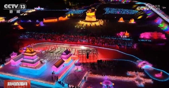 临近零点人人生,一场融合科技光影与民族歌舞的跨年演出在晶莹闪烁的冰雕舞台上精彩亮相。